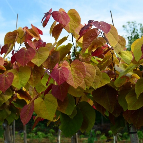 1. 形态特征:落叶小乔木或大灌木,株高6-9米,冠幅5-8米,树形呈圆润的伞状;早春先叶或花叶同放,花为蝶形,呈粉紫色,密集簇生于老枝与主干上;新叶为独特的艳红色,后逐渐转为绯红、浅绿,秋季叶片泛黄脱落。
